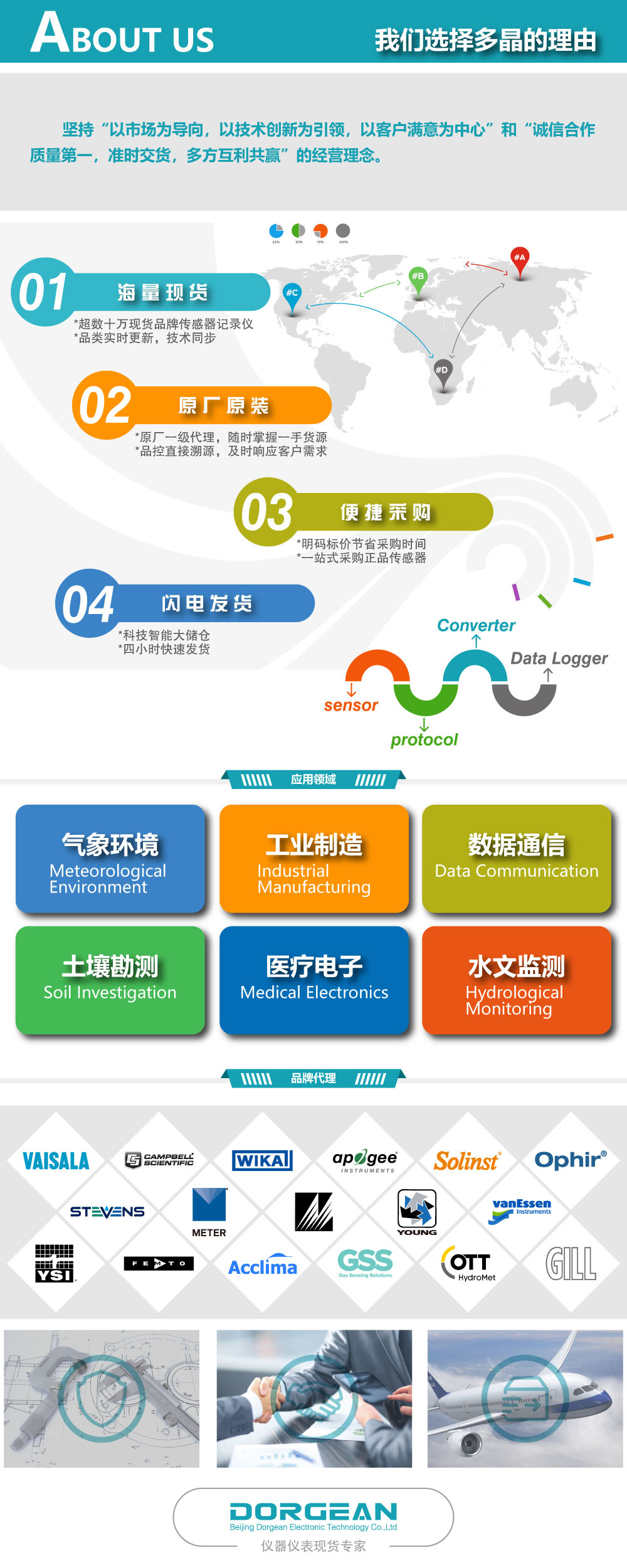 北京多晶電子科技有限公司(Beijing Dorgean Electronic Technology Co., LTD)是一家從事電子與光學儀器儀表先進服務的授權代理和經銷公司,可在氣象、水文、環(huán)境監(jiān)測、空氣質量分析、土壤檢測等領域對您的設施和過程進行測試、測量、分析和控制。我們與Meter、Temtop、Acclima、Hash(HACH)、RM.YOUNG、Met One、Apogee、TSI、YSI、Femto、Hukseflux、Delta-T、GILL、Alphasense、Geonor、Ophir、Solinst等全球知名廠商建立了第三方技術推廣服務授權。我們及時準確地掌握行業(yè)信息,在廠家的大力支持下已經成功地為數千家機構和企業(yè)提供了各種產品、咨詢、解決方案和服務。