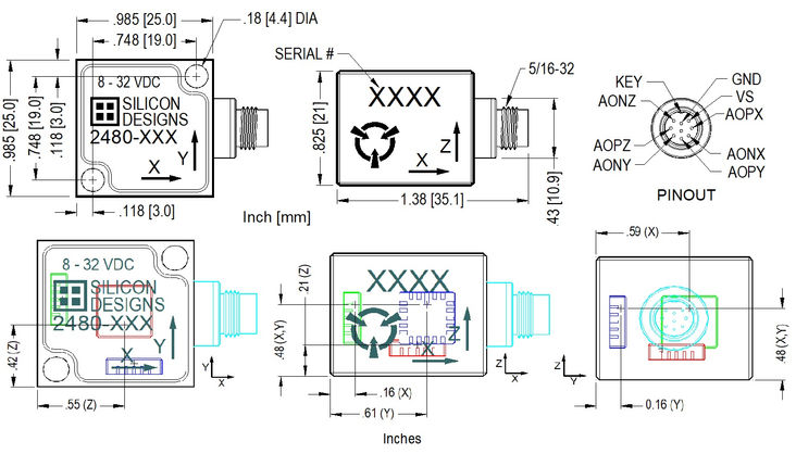 對(duì)于所有型號(hào):在沒(méi)有特別指定的情況下,默認(rèn)的供電電壓(Vs)為+8至+32伏直流電,測(cè)試條件下的溫度(TC)設(shè)定為25攝氏度,并且處于差分模式。加速度測(cè)量范圍(量程)為±g,對(duì)應(yīng)的輸出電壓范圍是8000毫伏。