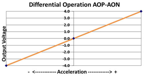 這些加速度計(jì)模塊產(chǎn)生隨加速度變化的差分模擬輸出電壓對(duì)(AON和AOP)。信號(hào)輸出在大約2.5伏的共模電壓附近是完全差分的。在零加速時(shí),輸出差分電壓標(biāo)稱為0伏直流電;在±滿刻度加速度下,輸出分別為±4伏直流電,如圖(下圖)所示。輸出比例因子與+8至+32伏的電源電壓無關(guān)。