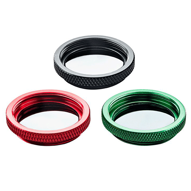 單個濾光片有三個版本,紅色外殼中的 ND1 濾光片在可見光中具有約 10% 的透射率,黑色外殼中的 ND2 濾光片具有約 1% 的透射率,綠色外殼中的 ND3 濾光片具有約 0.1% 的透射率。單獨的濾光片可以 用螺絲固定在彼此的頂部,因此可以堆疊,也可以與分束器結(jié)合使用。它們在外殼中設置成較小的楔角,以免造成干擾影響。
