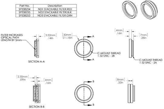 用于相機的 4mm 間距螺旋濾光片,透射率在 2% 到 0.05% 之間,具體取決于光譜范圍??梢远询B并與其他濾光片和分束器組合