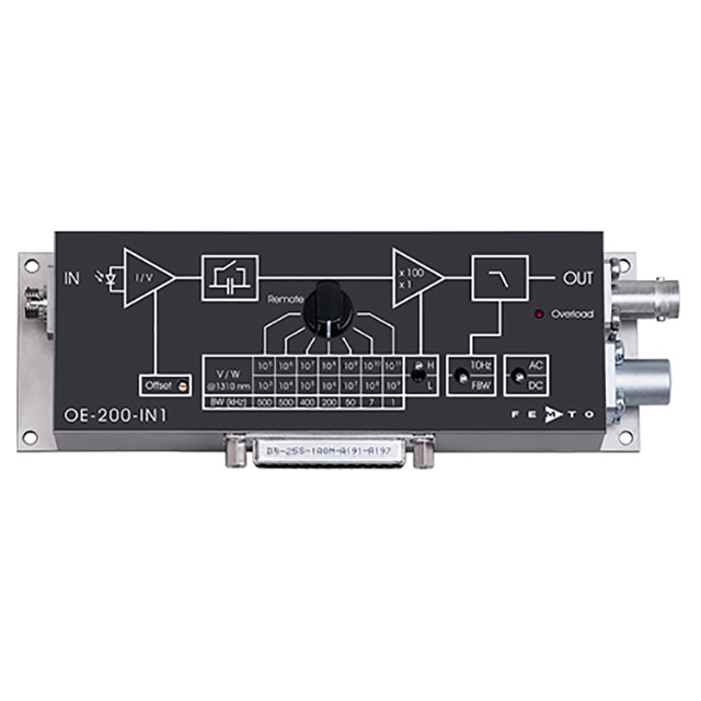 OE-200 系列可變?cè)鲆婀饨邮掌鲗?zhuān)為需要快速、精確測(cè)量小光信號(hào)的各種應(yīng)用而設(shè)計(jì)。通過(guò)將低噪聲跨阻放大器與硅或 InGaAs 光電二極管相結(jié)合,可以覆蓋從 190 nm 到 1700 nm 的寬波長(zhǎng)范圍。集成放大器提供從 103到 1011的可調(diào)增益V/W,因此允許在從 ca 的寬動(dòng)態(tài)范圍內(nèi)進(jìn)行測(cè)量。100 fW 至 2 mW 光輸入功率。其高靈敏度是通過(guò)低噪聲設(shè)計(jì)實(shí)現(xiàn)的,噪聲等效功率 (NEP) 低為 6 fW/√Hz。許多附加功能,如可切換信號(hào)濾波器、偏移調(diào)整以及通過(guò) PC 進(jìn)行手動(dòng)和光隔離遠(yuǎn)程控制的能力,使 OE-200 成為同類(lèi)產(chǎn)品中通用的光接收器。