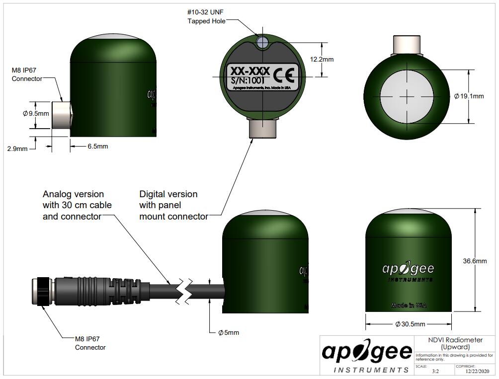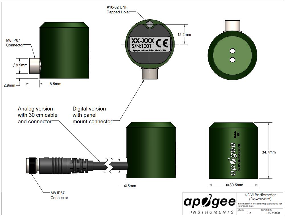S2-111 NDVI 傳感器是一種獨(dú)特的雙通道傳感器,用于測量 650 nm(紅色)和 810 nm(NIR)并且是自供電的。該傳感器采用堅固的鋁制外殼,可完全浸入水中,可承受惡劣條件,并采用預(yù)鍍錫尾纖引線端接高質(zhì)量電纜,可輕松連接到數(shù)據(jù)記錄器和控制器。傳感器電纜包括一個 IP68 航海級不銹鋼電纜連接器,以簡化從安裝中拆卸和更換傳感器以進(jìn)行維護(hù)和校準(zhǔn)的過程。NDVI 傳感器的典型應(yīng)用包括測量監(jiān)測植物冠層。NDVI與植物冠層葉面積和葉片冠層葉綠素含量有關(guān),常用于春季綠化和秋季衰老的監(jiān)測。
