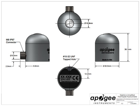Apogee Instruments SP-522熱射計由熱電堆探測器、丙烯酸擴散器、加熱器和信號組成 處理電路安裝在陽極氧化鋁外殼,和電纜連接傳感器到一個 測量設(shè)備。傳感器是盆栽固體,沒有內(nèi)部空氣空間,并為連續(xù)設(shè)計 室外環(huán)境短波輻射的測量。SP-522模型輸出數(shù)字信號使用 基于RS-232或RS-485的Modbus RTU通信協(xié)議。