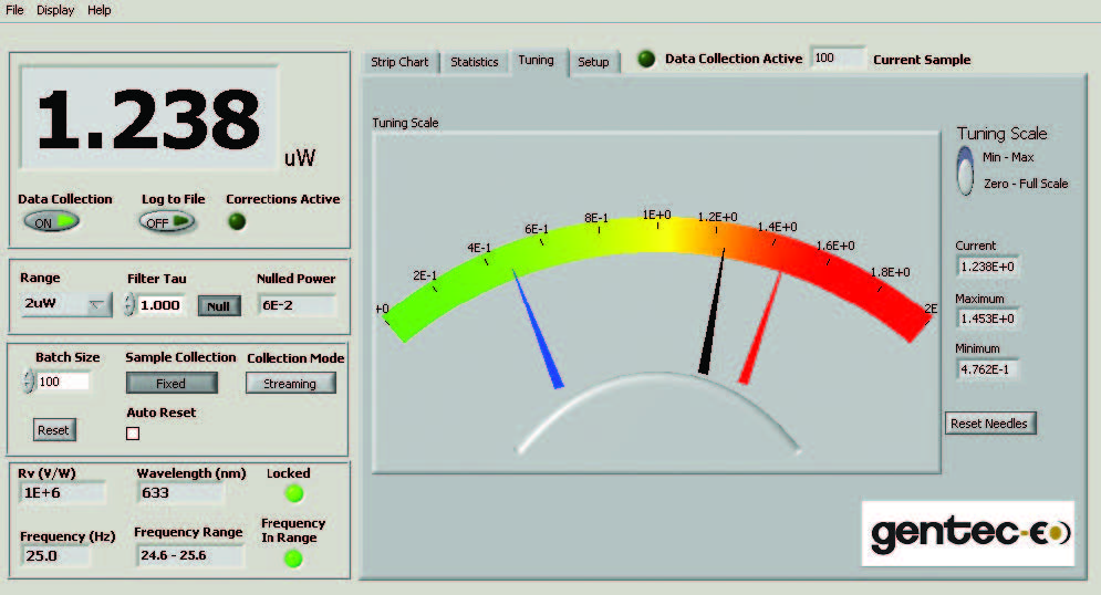 無論選擇哪個顯示屏標簽,儀器控制和輻射功率測量值始終可見,因此可輕松更改輻射計設置。儀器控制包括:量程、Tau 過濾器、批次大小、數(shù)據(jù)收集模式、重置選項和用于背景消除的空按鈕。此外,還有更多設置和操作狀態(tài)指示燈,包括:探測器接收、波長、頻率(實際)、鎖定和量程內(nèi)頻率等指示燈。帶狀圖可連續(xù)或按批次顯示以瓦為單位的輻射功率測量值。請選擇滿刻度、自動刻度或手動定標選項。