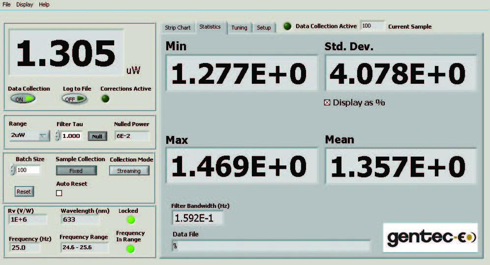 在“統(tǒng)計數(shù)據(jù)”選項卡下,有 4 個包含所選批次統(tǒng)計數(shù)據(jù)的大窗口,分別為:小值、大值、標準差和平均數(shù),以工程計數(shù)法表示。用戶可選擇以瓦或 % 來顯示標準差。另外還有一個窗口可以根據(jù)用戶選擇的“Tau 過濾器”(0.100 至 100 秒)顯示數(shù)字帶通過濾器的帶寬。設置時,應使用較小的時間常數(shù);進行測量時,應使用較大的時間常數(shù),特別是在儀器的量程低端。