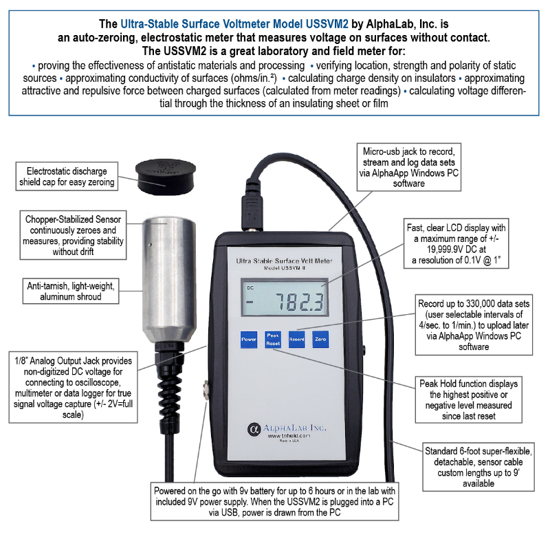USSVM2 型穩(wěn)定表面電壓表采用傳感器快門/開關(guān)技術(shù),可提供長期穩(wěn)定性而無漂移。該技術(shù)還消除了由于帶電空氣分子(空氣離子)導(dǎo)致的錯(cuò)誤或偏移讀數(shù)。該傳感器有一根 29 英寸的可拆卸電纜,可延長至 9 英尺。