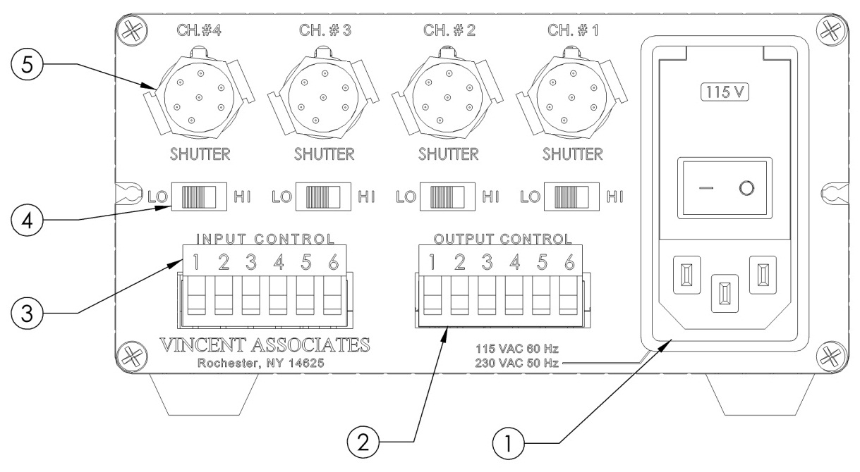 | LO/HI 選擇滑動開關(guān) (4) | “HI” 位置允許為 35 mm 和更大的快門選擇合適的脈沖能量?!癓O” 位置適用于 25 mm 和更小光圈的快門。每個通道一個。 |