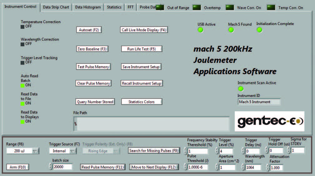 強大的 LabView 應(yīng)用軟件包括許多的控制和診斷功能。左邊所示的儀表控制屏幕用于設(shè)置 MACH 6 的運行,包括量程、觸發(fā)、波長和其他項目。此外,還可通過該界面設(shè)置脈沖批大小并配置儀表,從而啟動數(shù)據(jù)采集。您可以通過該控制屏幕訪問“自動設(shè)置”、“調(diào)用實時模式”、“運行壽命測試”、“保存儀表設(shè)置”等功能。直接點擊或者按下相關(guān)的功能按鈕便可訪問這些功能。