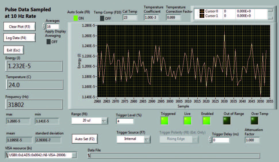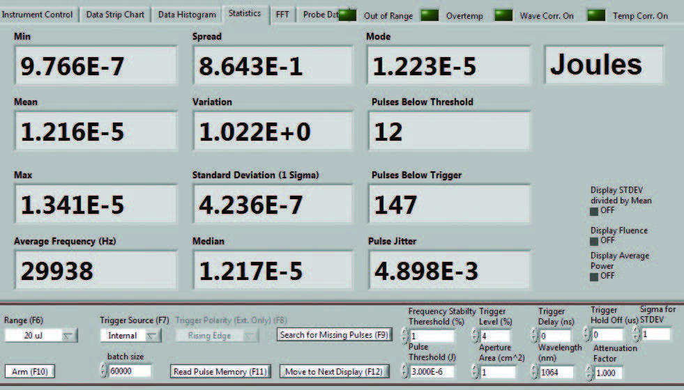 實時模式可從儀表控制屏幕訪問,您也可以簡單按下計算機上的“F4”功能鍵訪問該功能。在此模式下,由于需要在 10 Hz 頻率下采集激光脈沖樣本,儀表有意像普通慢速數(shù)字焦耳計一樣運行。該模式為您提供能量帶狀圖、實時能量讀數(shù)、統(tǒng)計數(shù)據(jù)和重復(fù)率。在設(shè)置激光器的 Mach 6 時,此模式非常有用。您可以選擇“自動設(shè)置”,使用這一功能時儀表會跑遍各個量程和觸發(fā)電平,直至其找到正確的范圍;您也可以手動進(jìn)行設(shè)置。設(shè)置完成后,您將退出該界面并返回到“控制”界面,然后在該界面選擇批的大小,配置儀表并開始采集脈沖能量數(shù)據(jù)。