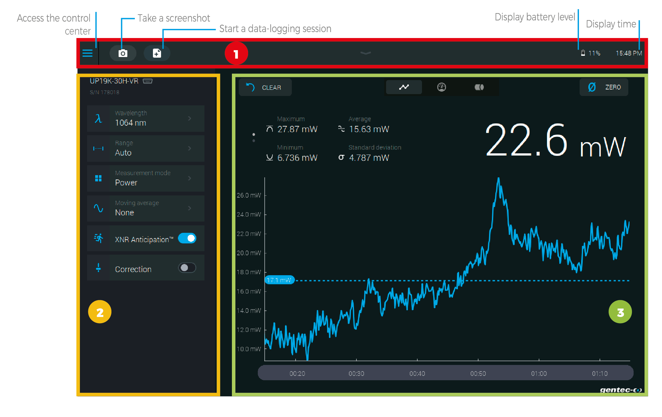 1 - 導(dǎo)航欄 —— 在屏幕頂部,有直接進(jìn)入控制中心的通道、數(shù)據(jù)采集按鈕和各種指示值(電池電量和時(shí)間)。