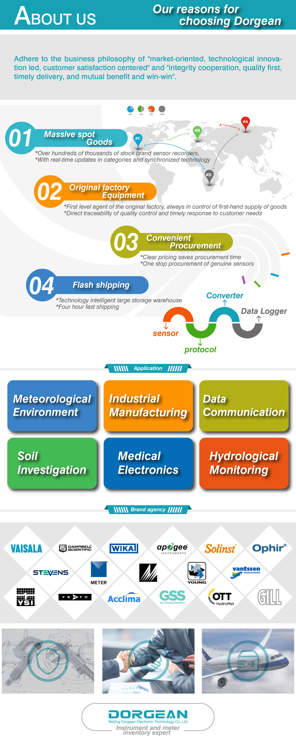 Beijing Dorgean Electronic Technology Co., LTD is an outstanding agent in the advanced service distribution of electronic and optical instrument and meters to test, measure, analyze, and control your facility and your process in meteorology, hydrology, environmental monitoring, air quality analysis, soil testing, etc. We have established excellent third-party technology promotion service authorization with the global famous manufacturers such as Meter, Temtop, Acclima, Hash(HACH), RM.YOUNG, Met One, Apogee, TSI, YSI, Femto, Hukseflux, Delta-T, GILL, Alphasense, Geonor, Ophir, Solinst, and so on. Timely and accurately grasping industry information, we have successfully provided a variety of products, consultations, solutions and services for thousands of institutions and companies with the strong support of manufacturers.