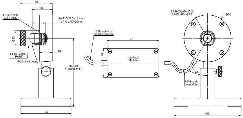 The BeamTrack series 3A-QUAD laser measurement sensor measures laser beam position well as power and energy. It has a 9.5mm aperture and can measure beam position to 0.15mm accuracy. It measures power from 100μW to 3W and energy from 20μJ to 2J. The sensor comes with a 1.5m cable that connects it to the electronic box, and another 0.5m cable that connects the box to a Meter or PC interface.