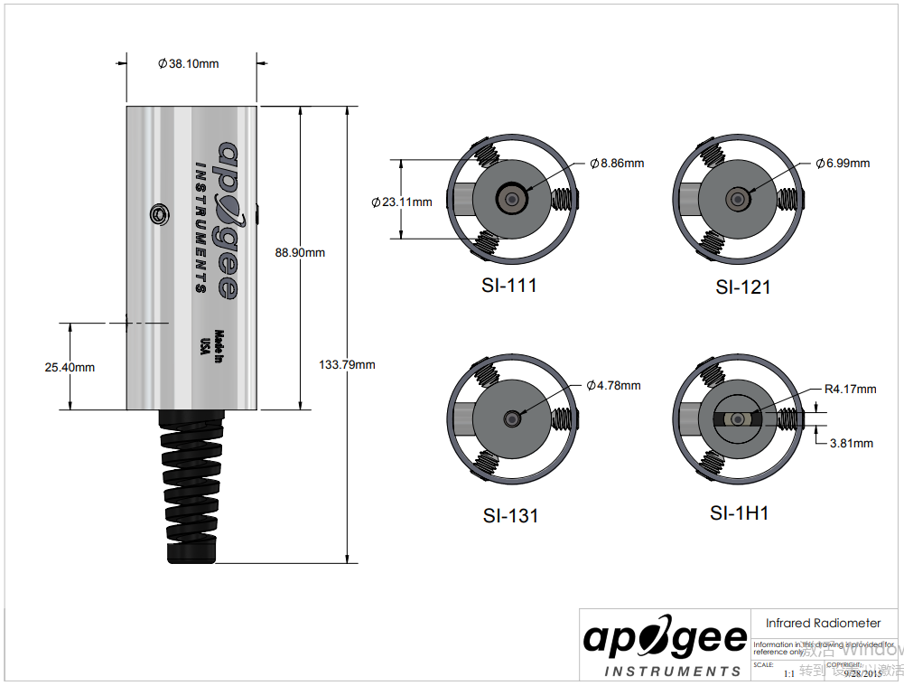 The MI-2H0 has a hand-held meter, attached via cable, that displays and stores sensor measurements. The unique geometry of the sensor gives a wide 32° half-angle field of view in the horizontal direction with a 13° half-angle field of view in the vertical direction. This enables the user to mount the sensor at shallower angles without seeing above the horizon while maximizing the area measured. The sensor has a response time of 0.6 seconds. Typical applications include plant canopy temperature measurement for use in plant water status estimation, road surface temperature measurement of determination of icing conditions, and terrestrial surface (soil, vegetation, water, snow) temperature measurement in energy balance studies.