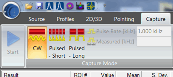 Can a NanoModeScan unit be triggered to capture a pulsed source?The NanoScan can capture a high repitition rate pulsed laser source but it can not be triggered from the laser itself. To capture a pulsed source on the NanoScan you must choose one of the pulsed settings under the Capture tab. The laser pulse rate must also be greater than 100 kHz.