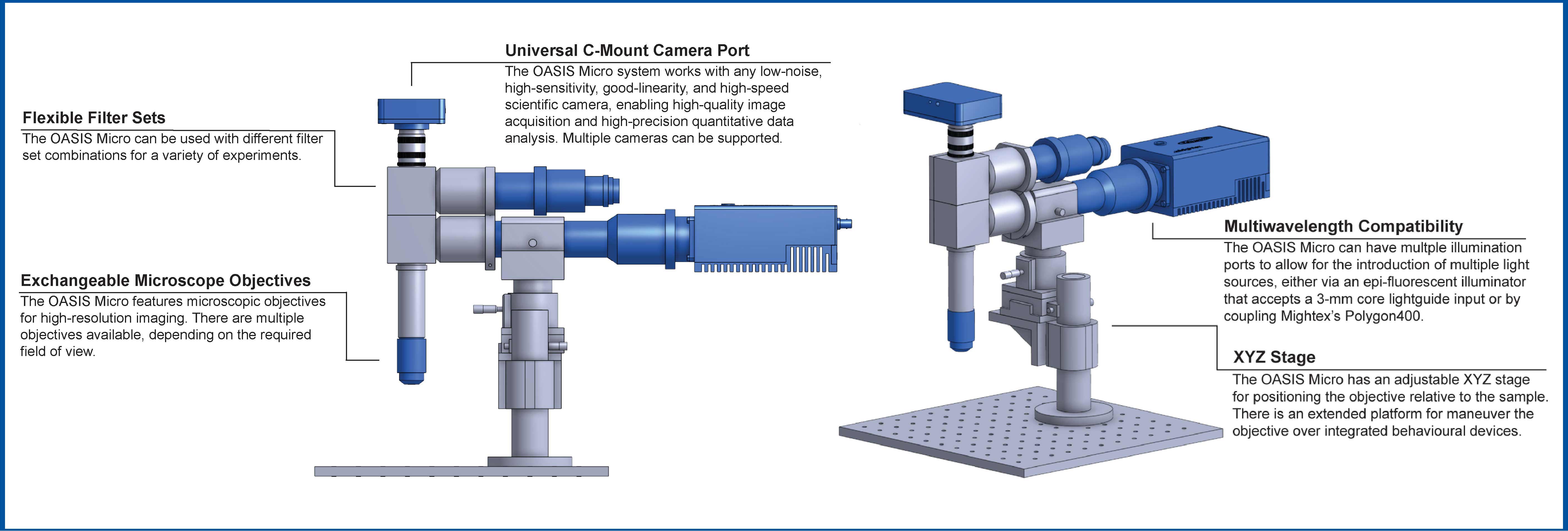The OASIS Micro is designed for in vivo experiments with a minimalist design. A heavy-duty precision XYZ stage is mounted on the support structure and the OASIS optical assembly is in turn mounted on the XYZ stage. The XYZ stage controls the lateral motion as well as the focus of the system.