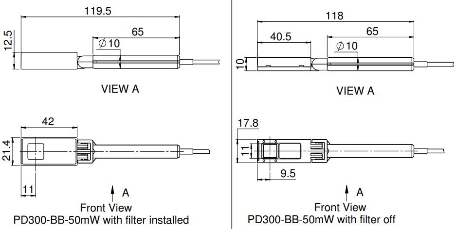 The PD300-BB-50mW radiometric sensor has a flat spectral response photdiode sensor for measuring broadband light sources. It covers the spectral range 430 - 1000nm and has a 10x10mm aperturewith swivel mount and a removable filter. Without filter its power measuring range is 50pW – 4mW. With filter the power range is 1nW - 50mW. The sensor comes with a 1.5 meter cable for connecting to a meter or PC interface.