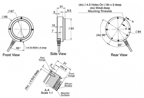 The PE80BF-DIF-C is a pyroelectric energy meter with a diffuser for concentrated beams. It has a 67mm aperture and can measure energies from 4mJ up to 40J. It can operate at repetition rates up to 250Hz and covers the spectral range from 0.19 - 2.2, 2.94μm. The sensor comes with a standard 1.5 meter cable for connecting to a meter or PC interface.