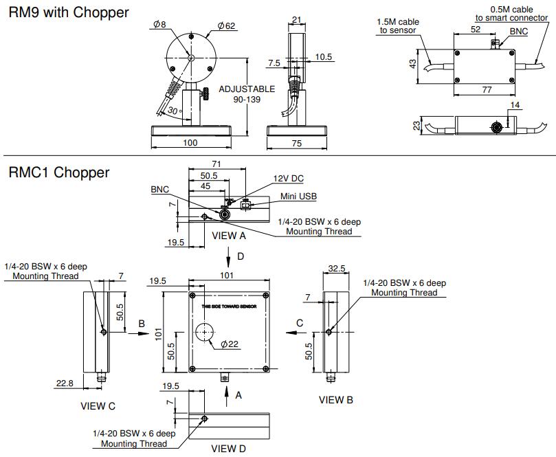 The RM9-THz radiometer system is a sensor and optical beam chopper combination for measuring the power of very low level CW or quasi CW light sources. This sensor was specially designed for work in the terahertz range. The RM9-THz sensor has a pyroelectric element to measure a wide dynamic range of radiation, from 100nW to 100mW. It has an 8mm aperture and covers the spectral range from 0.1THz to 30THz. The system comes with the RMC1 chopper that is placed between the source and the RM9 sensor.The chopper should be mounted with the side marked "THIS SIDE TOWARD SENSOR" facing the sensor.