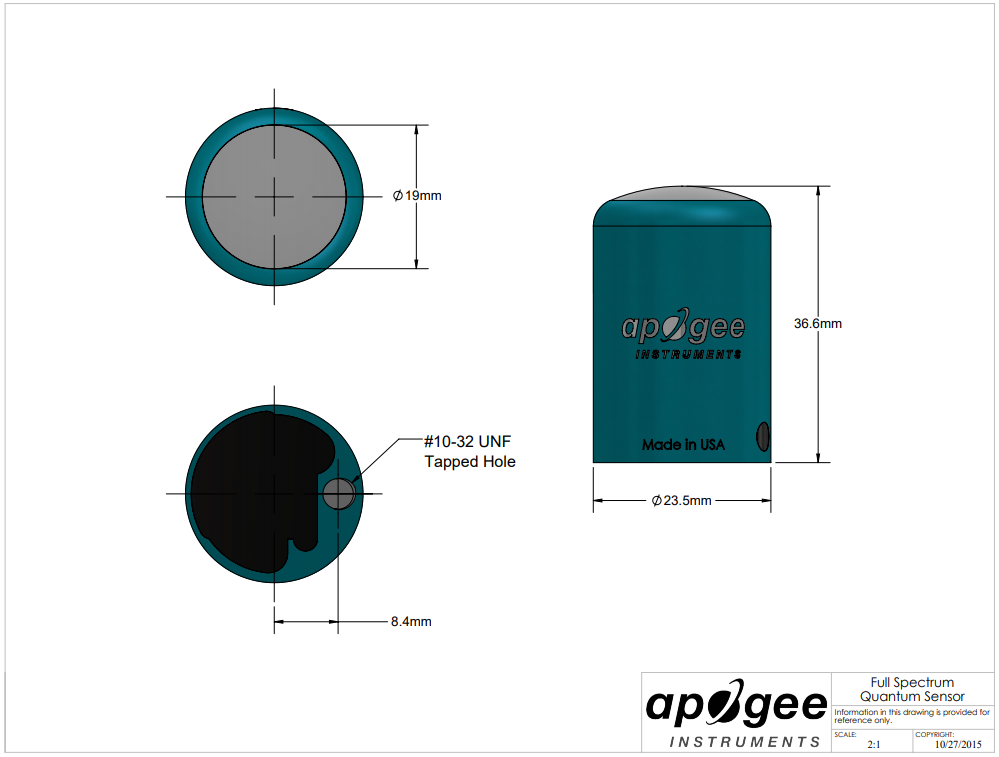| Calibration Factor (Reciprocal of Sensitivty) | 0.8 μmol mˉ2 sˉ1 per mV |