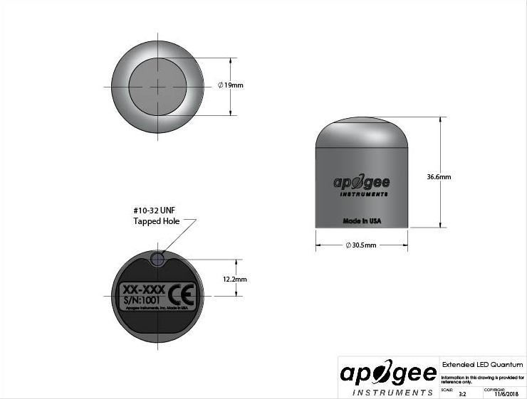The SQ-640 Quantum Light Pollution sensor is a self-powered sensor. The sensor features a rugged, aluminum housing that is fully-submersible and built to withstand harsh conditions, and high-quality cable terminating in pre-tinned pigtail leads for easy connection to dataloggers and controllers. The sensor cable includes an IP68 marine-grade stainless-steel cable connector to simplify sensor removal and replacement from permanent installations for maintenance and calibration. Typical applications of Quantum Light Pollution sensors include incoming PFD measurements over plant canopies in indoor greenhouses or in growth chambers, and reflected or under-canopy (transmitted) PFD measurements in the same environments. Since the detector on this particular Quantum Light Pollution sensor is sensitive to radiation with wavelengths up to 1100 nm, beyond the range of wavelengths that influence plants, we recommend only using the SQ-640 sensors in indoor grow environments utilizing LED lights.
