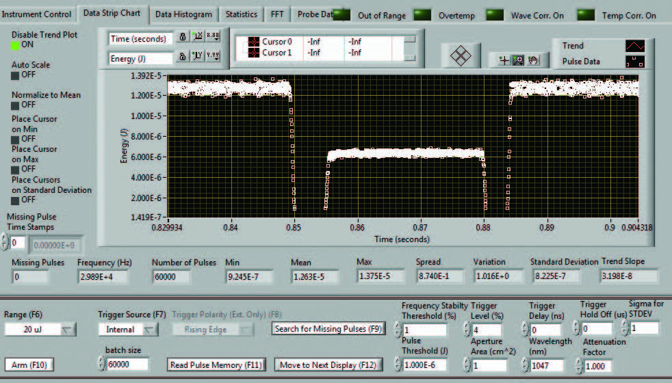 實時模式可從儀表控制屏幕訪問,您也可以簡單按下計算機上的“F4”功能鍵訪問該功能。在此模式下,由于需要在 10 Hz 頻率下采集激光脈沖樣本,儀表有意像普通慢速數(shù)字焦耳計一樣運行。該模式為您提供能量帶狀圖、實時能量讀數(shù)、統(tǒng)計數(shù)據(jù)和重復(fù)率。在設(shè)置激光器的 Mach 6 時,此模式非常有用。您可以選擇“自動設(shè)置”,使用這一功能時儀表會跑遍各個量程和觸發(fā)電平,直至其找到正確的范圍;您也可以手動進(jìn)行設(shè)置。設(shè)置完成后,您將退出該界面并返回到“控制”界面,然后在該界面選擇批的大小,配置儀表并開始采集脈沖能量數(shù)據(jù)。